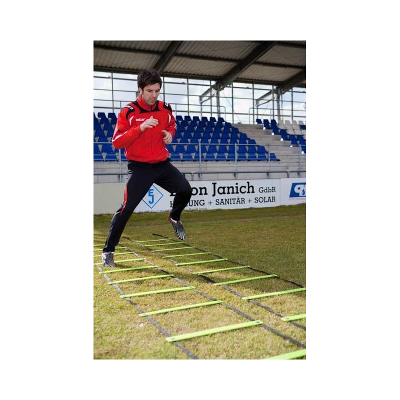 4843 - Idealna do ćwiczeń koordynacji ruchowej. Wysokiej jakości drabinka z tworzywa sztucznego, składająca się z dwóch elementów o długości 4 metrów każdy, które są składane w poręcznym uchwycie. Szerokość około 50 cm. 11 poprzecznych pasków standardowej odległości 40 cm z oznaczeniem na taśmie. Poziome paski można swobodnie przesuwać do indywidualnej regulacji odległości. W zestawie torba.