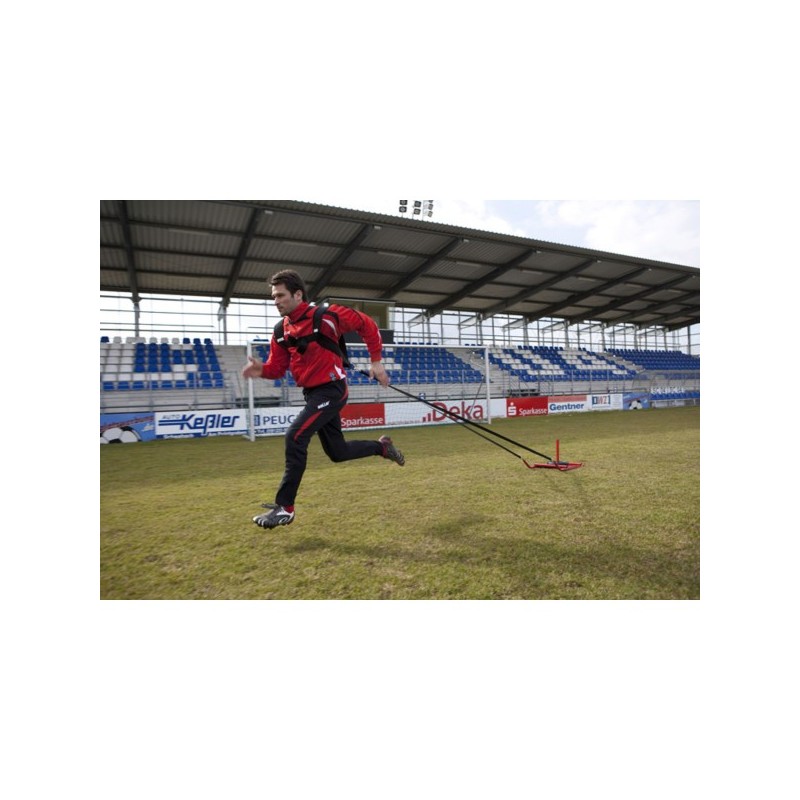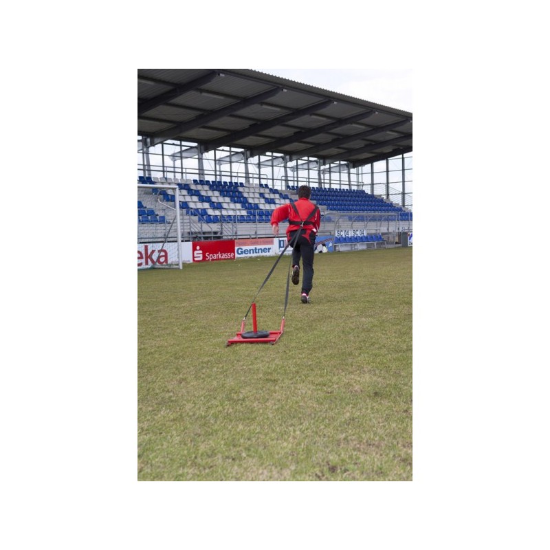 4964 - Wysokiej jakości metalowe sanie do treningu siłowego i szybkościowego na naturalnej trawie. Sanie składają się się z metalowych sań, z metalowego stożka na którym osadza się obciążenie, dwa pasy z dwoma karabińczykami. Pas trakcyjny z wyściełany miękkim materiałem i wyposażony w klamry do mocowania na klatce piersiowej.